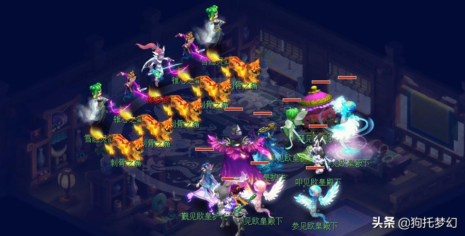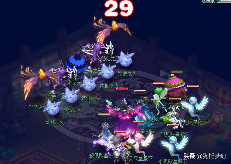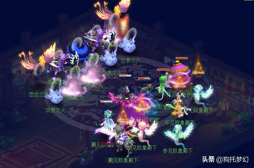 主怪,红萼仙子。门派DT,第1回合固定弱点,第2回合开始,固定使用横扫千军点杀漫天花雨的目标。