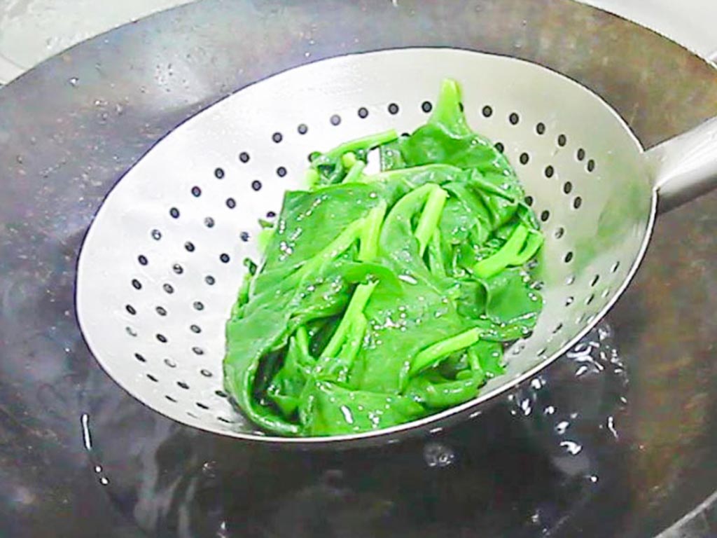 2.锅内烧水,放入一勺植物油和苋菜焯水10秒钟,即可倒出冲凉备用。