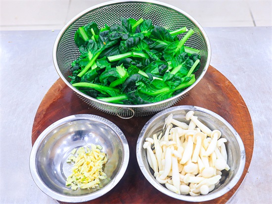 1.一颗黑白菜去除根部;一把白玉菇切掉根部后撕开备用;大蒜拍扁切成末。