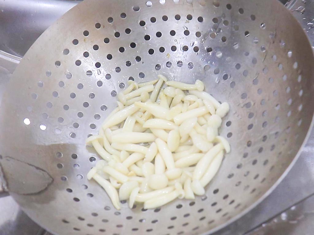 2.起锅烧水加入少许食盐和植物油,水烧开以后放入白玉菇焯水30秒钟倒出来冲凉备用。