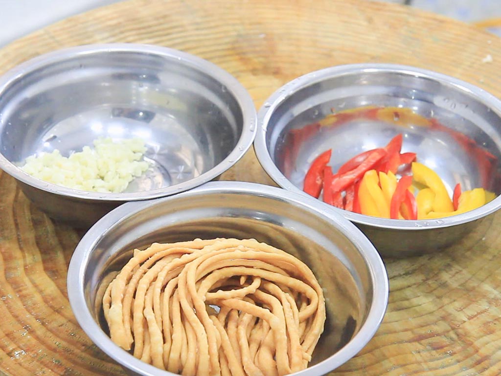 1.准备田七260克清洗干净;大蒜拍扁剁成蒜末;红椒和黄椒各一片切成辣椒丝;炸好的馓子100克放在盆中备用。