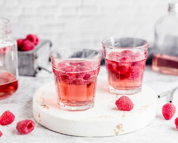 3、取一只干净又漂亮的玻璃杯,依次往杯中加入树莓味糖浆、柠檬汁、冰块,之后放入5颗树莓,倒入气泡水后,再取一颗树莓放在顶部做装饰即可,喝的时候适当搅拌,让糖浆自然融合在气泡水中。