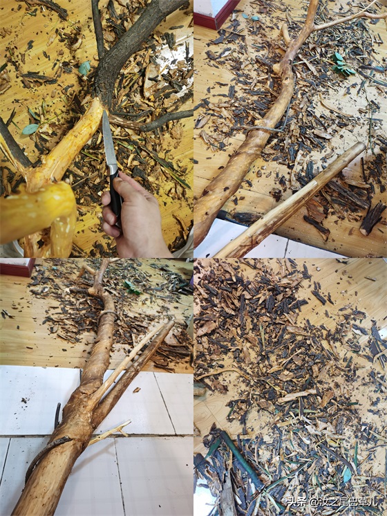 粗略修枝,先把小枝叉都锯掉了,留出个大概造型。然后开始漫长而艰难地扒皮过程,没有专业工具,拿个水果刀一点点撬,三个小时,从白天扒到黑夜,简直要怀疑人生了。