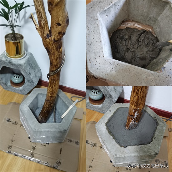 最后就是想办法把它立起来了,一开始很犯难,不过后来在一个老屋的屋后发现了一些六边形的水泥墩子,问主人讨了两个(一开始说买的,主人说没啥用,随便拿。),先用一层水泥封了个底,一天之后又灌水泥把树“种”进入,三天之后,水泥干透,大功告成。