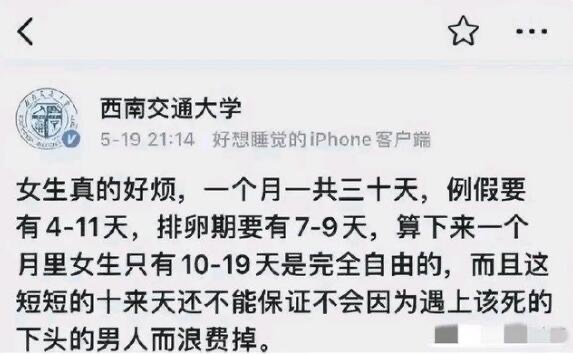 西南交通大学官方微博在5月19日发了一条微博,虽然这条微博很快被删除,但内容还是引起网络争议,因为主要就是说女生每个月只有10-19天完全自由,然而在这期间还可能遇到“下头男”而浪费掉,一方面是引起男女对立,另一方面对“下头男”的不理解。