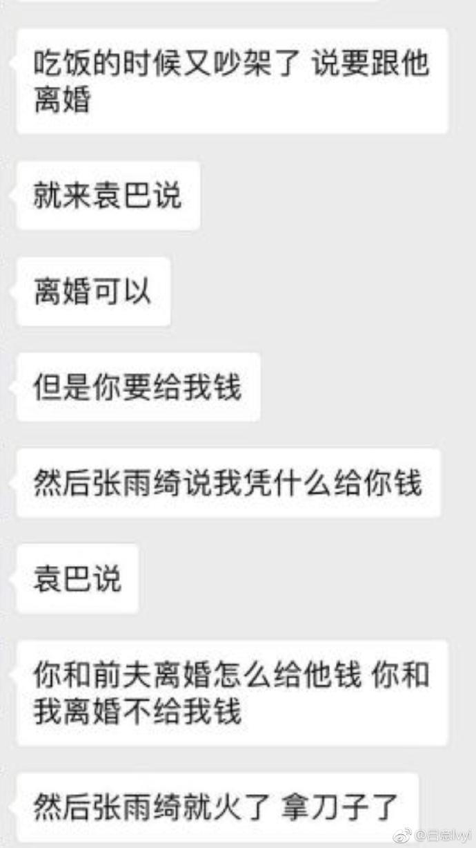 事情过去后没多久,而就在前几天(24日晚)吃饭的时候又吵架了,一向敢爱敢恨的张雨绮闹着提出要离婚,没想到袁巴元不仅答应还提出索要钱财的要求,只因为张雨绮当初与王全安离婚的时候是净身出户,所以袁巴元也想要张雨绮净身出户,二人因此又吵架起来,这次张雨绮动怒甚至拿起了水果刀。