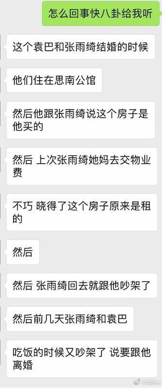从曝光的聊天记录有一位知情人透露当初张雨绮结婚的时候袁巴元承诺在上海思南公馆的房子是自己买的,属于名下房产,结果近期张雨绮妈妈去交物业费的时候发现房子其实是租的,张雨绮因为这件事和袁巴元大吵了一架。