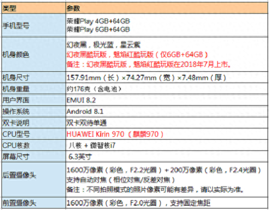 荣耀Play的机身尺寸等参数往上看↑ ↑ ↑ 手机颜色分别为:幻夜黑,极光蓝,星云紫。