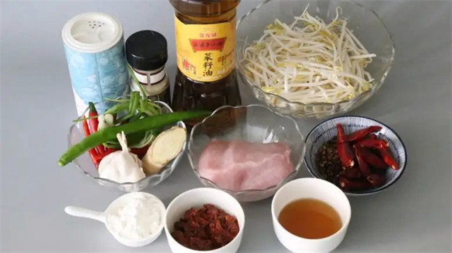 第一步准备食材。准备适量的瘦肉,可以是牛肉,也可以是鸡肉或者是猪肉,将瘦肉切成片,放在碗中备用,生姜,大葱,料酒,八角,干辣椒,盐,胡椒粉,豆芽等等。