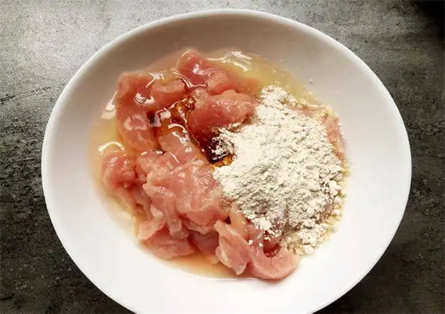 第三步腌制肉片。将切好片的瘦肉清洗干净,放到碗中进行腌制,向碗中加入盐,料酒,胡椒粉等等调料,抓拌均匀后放入冰箱冷藏一段时间后备用。