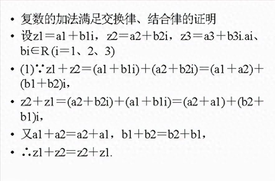 加减法运算 设z1=a+bi,z2=c+di是任意两个复数,它的实部是原来两个复数实部的和,它的虚部是原来两个虚部的和:(a+bi)±(c+di)=(a±c)+(b±d)i。乘法运算 设z1=a+bi,z2=c+di是任意两个复数,则:(a+bi)(c+di)=(ac-bd)+(bc+ad)i。其实就是把两个复数相乘,类似两个多项式相乘,结果中i=-1,把实部与虚部分别合并。两个复数的积仍然是一个复数。除法运算 复数除法定义:满足(c+di)(x+yi)=(a+bi)的复数x+yi(x,y∈R)叫复数a+bi除以复数c+di的商。