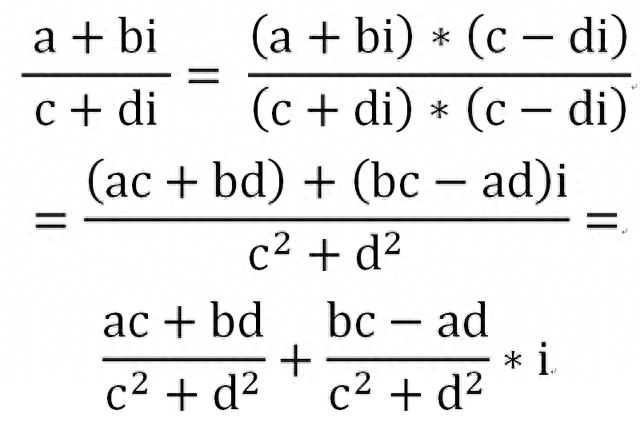加减法运算:(a+bi)±(c+di)=(a±c)+(b±d)i乘法运算:(a+bi)(c+di)=(ac-bd)+(bc+ad)i除法运算:(c+di)(x+yi)=(a+bi)