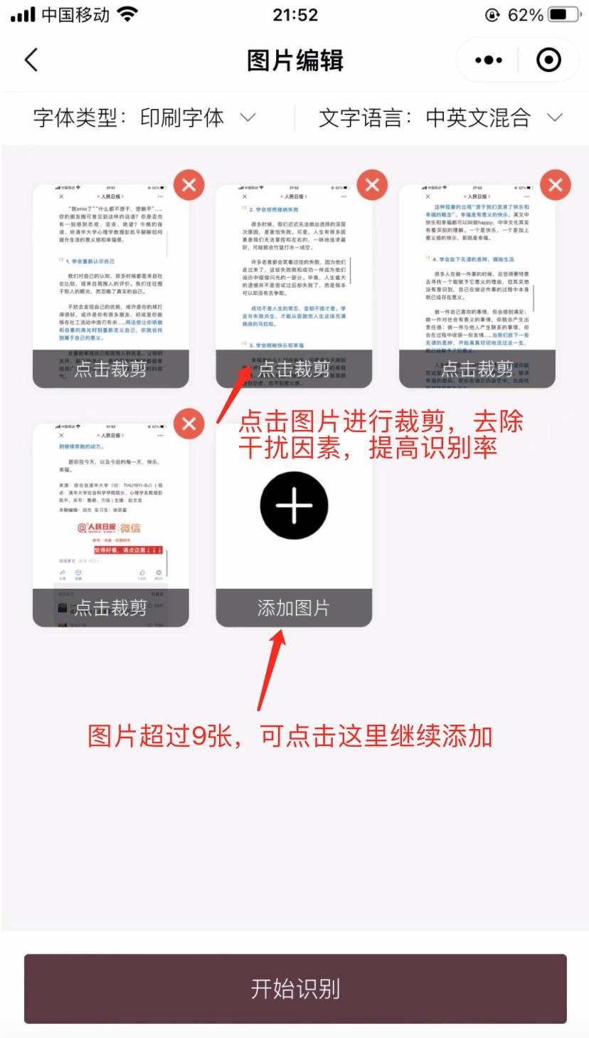 根据需要对图片进行裁剪,去除其他无关的干扰因素,提高图片识别的准确率。点击“添加图片”,可继续添加更多的图片。然后点击“开始识别”。