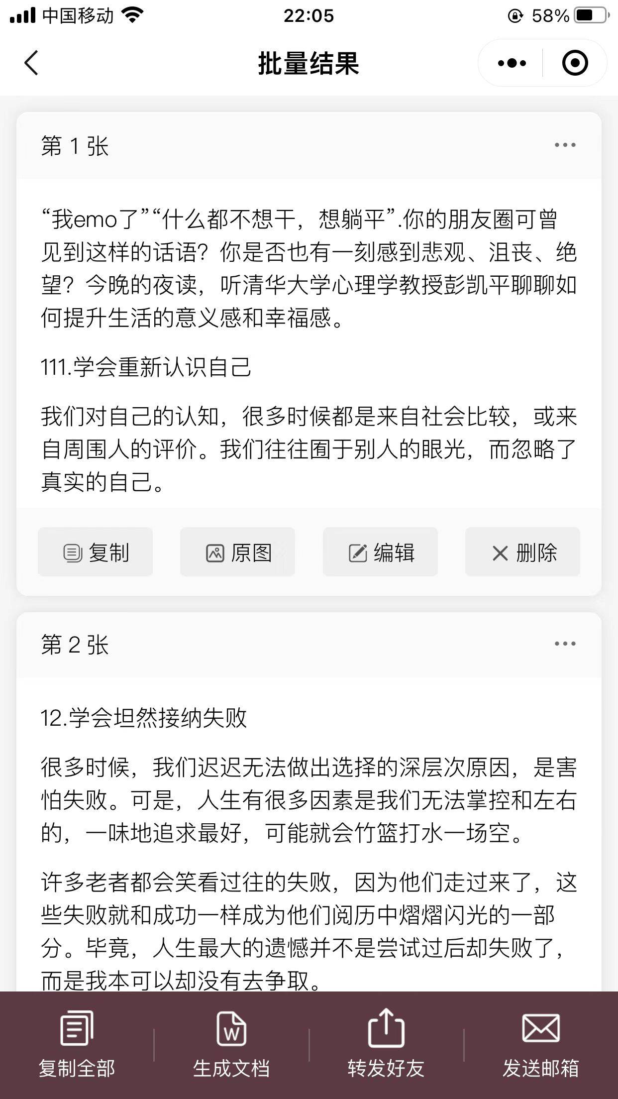 识别完成后,在识别结果页,可对识别结果进行校对编辑,最后可以对识别结果进行复制、生成文档(Word文档或者txt文档)、转发给好友、发送到邮箱。