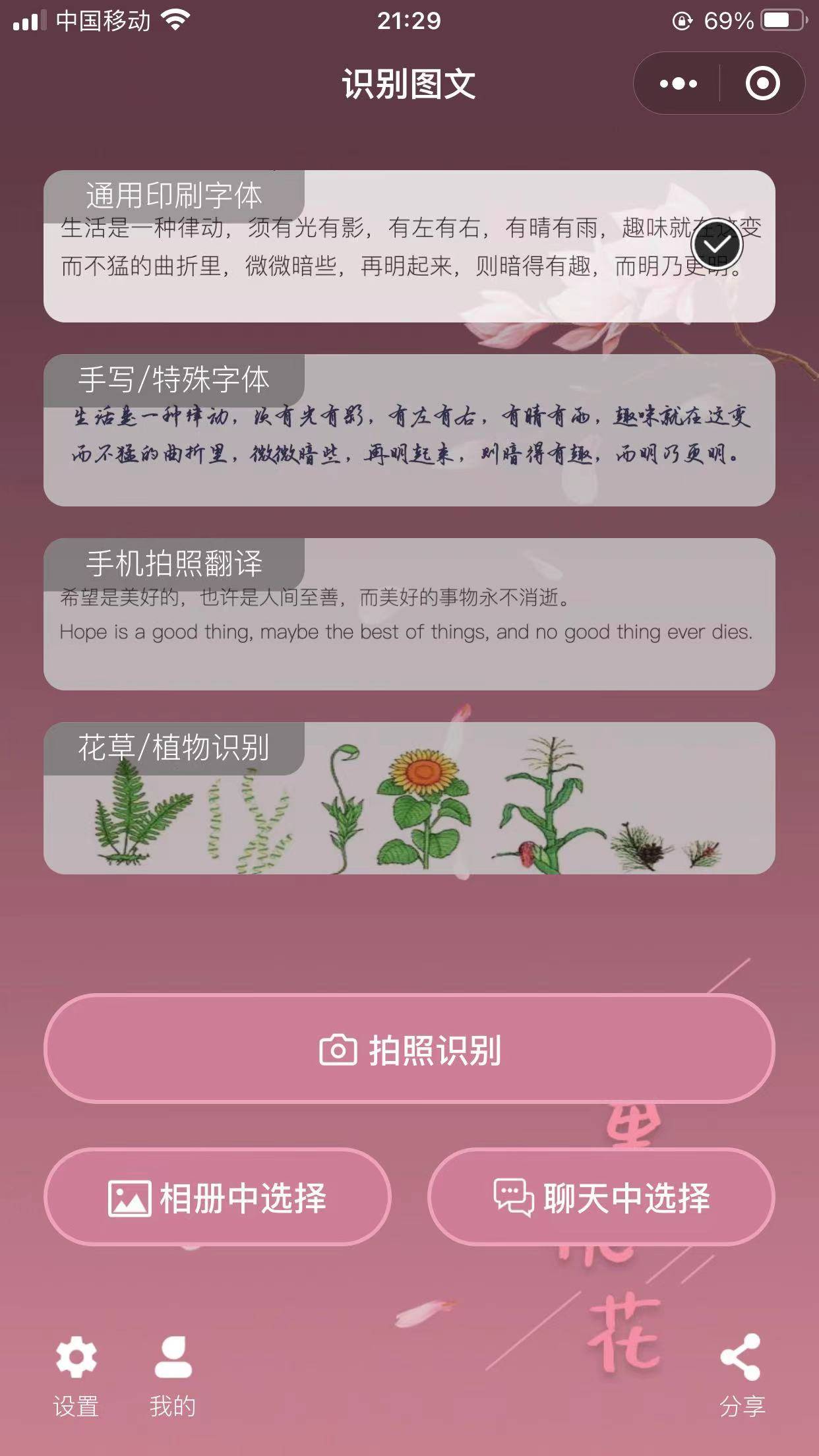 选择“通用印刷字体”,点击“相册中选择”,按顺序选择所有图片,如果图片数量超过9张,则需要分次选择。
