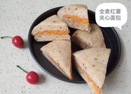 下图四是全麦面粉和红薯组合在一起做的美食,全麦面粉发酵,再夹上蒸熟的红薯,似馒头似面包的口感。