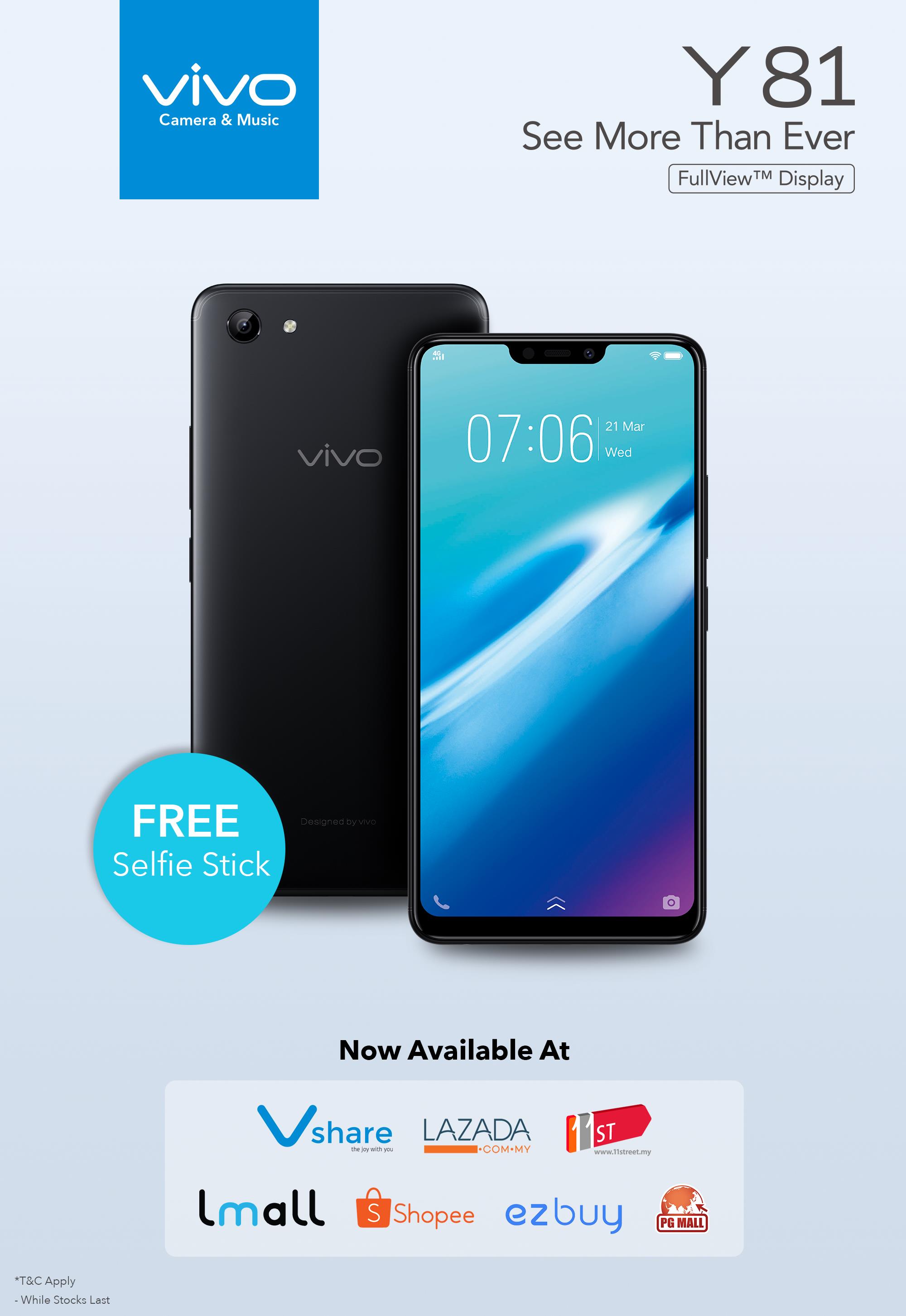 从今天起,消费者不单是能够通过线下任何一家vivo专卖店、授权经销商或合作商家购买,你也可以到各大线上平台,如:Lazada、11Street、Shope等购买vivo Y81,而且在线上购买的话,vivo还会赠送你一个免费的自拍杆(Selfie Stick)呢!