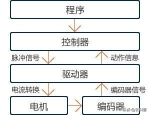 程序→控制器(脉冲信号)→驱动器(电流转换)→电机→编码器(编码器信号)→驱动器(动作信息)→控制器