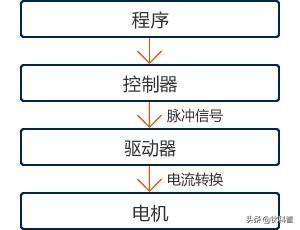 程序→控制器(脉冲信号)→驱动器(电流转换)→电机