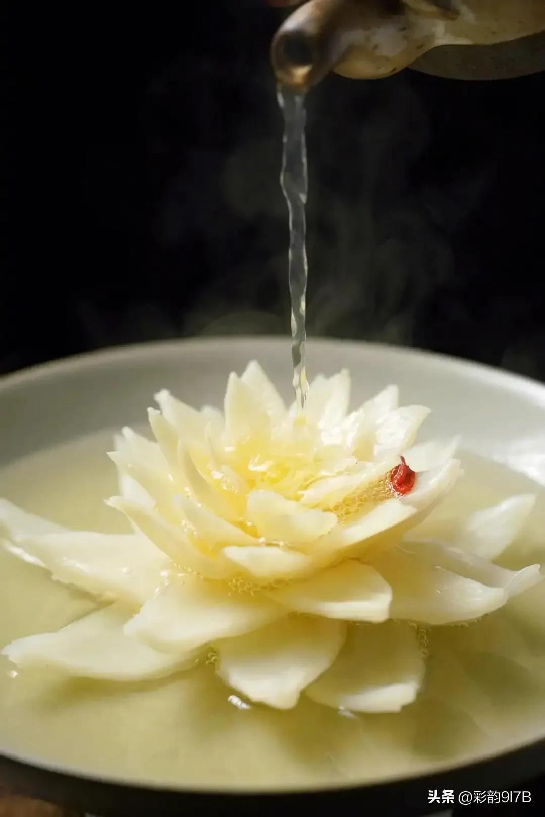这道菜,由精选的白菜心和熬制的清汤制作而成,看似朴实无华,却尽显制汤功夫。成菜后,汤醇淡素雅,清澈见底;菜色泽嫩绿,形态艳丽,见之顿觉清鲜明快;嗅之雅香扑鼻;食之柔嫩化渣,鲜香异常。