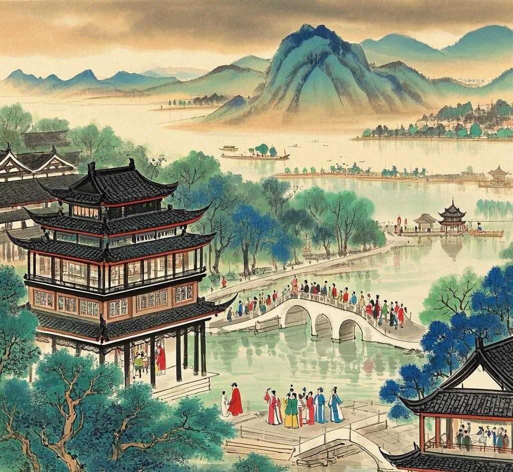 赏析:全面描绘杭州的繁华与美丽,如“三秋桂子,十里荷花”等句,从自然景观到人文风情,展现出杭州的富庶与热闹,为柳永都市词的代表。