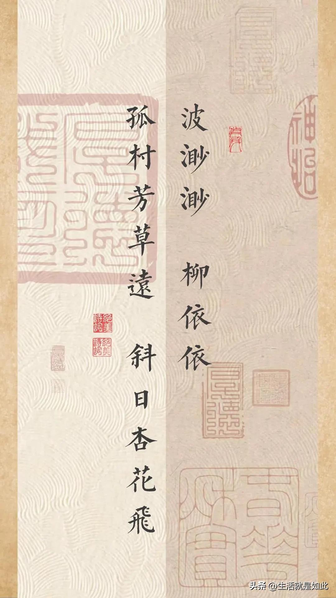 水波浩渺,烟雨朦胧,垂柳依依,随风轻摆。远方的孤村,芳草萋萋,夕阳斜洒,杏花随风飘零,点缀这片静谧的江南。这不是热闹的春景,而是一种空灵的美,带着淡淡的惆怅,如同一曲低回的琴音,在心头久久萦绕。