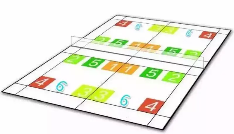 一般来说,都是按照上图这个位区发球的。不过,也有一些搭档聪明,和队友制订一套他们自己的暗语,来迷惑对手。比如伸出一个手指,本来是1号区,结果他们的暗语是4号区。
