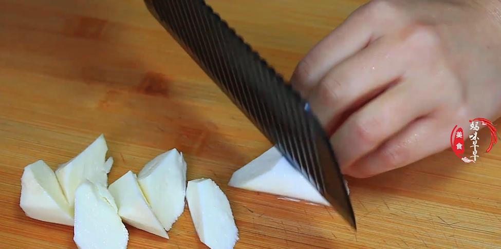 第二步,准备一根铁棍山药去掉皮,山药可以用热水烫一下,这样去皮就不痒了,去皮后的山药切成滚刀块,然后让入清水中备用。