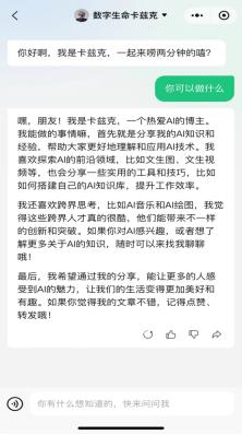 目前,公众号智能体的应用主要覆盖数字分身、智能客服、趣味对话等几个典型场景。AI 博主 " 数字生命卡兹克 ",从 2024 年 6 月开始尝试借助腾讯元器的能力搭建数字分身,在公众号后台回复读者提问。他表示," 一年前的数字生命计划,终于得以在我的公众号上,借助元器,得到了完美的实现 ",教育领域博主秋叶大叔,通过数字分身回答粉丝关于写书的问题。