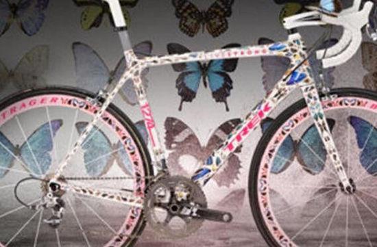 2、蝴蝶Trek Madone 售价:50万美元(343万人民币)。2009年款的Trek Madone,由苏富比拍卖行慈善义拍中以50万美元的天价售出,这台自行车在Trek Madone公路自行车的基础上,由艺术家戴米恩-赫斯特设计了外观涂装,车框上装饰的是闪闪发光、货真价实的蝴蝶翅膀透明涂层。在2009年环法自行车赛的第21赛段,由环法“七冠王(后于2012年被曝兴奋剂丑闻取消成绩)”兰斯-阿姆斯特朗所骑乘,通过巴黎香榭丽舍大道。