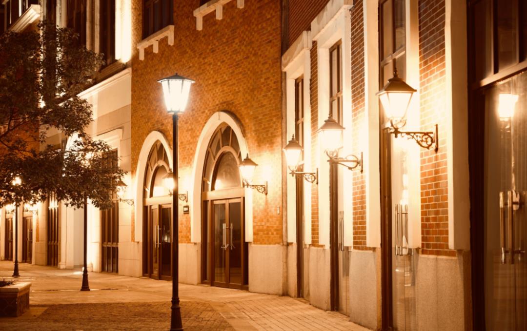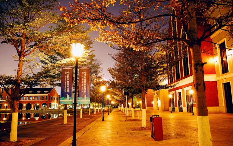 稀疏生长的树木虽不能在酷夏遮阳纳凉,却是秋天里的一道亮丽的风景线,在黄色的暖灯光的渲染下,使得整个小镇浪漫温馨的氛围感十足,不经意间飘下的落叶更是给小镇添上了浓郁的秋色。