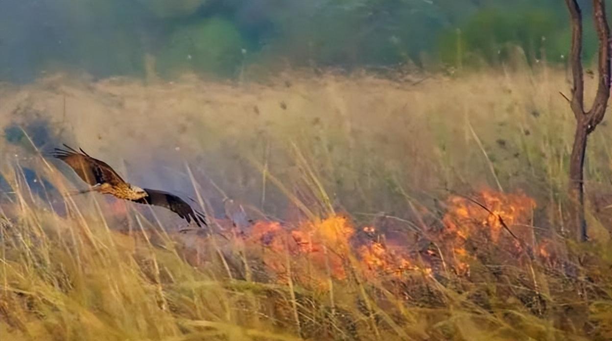 火灾发生后,躲在草丛和林木间的动物都会逃窜而出,此时就是黑鸢捕猎的最佳时机。