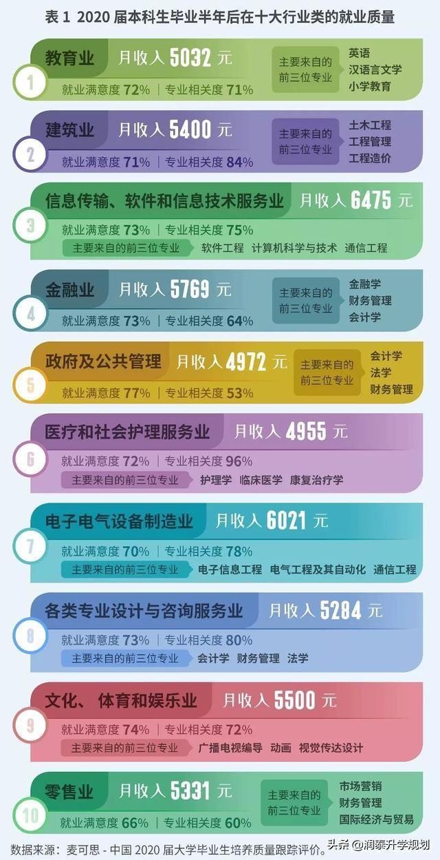 1、三年后人均月收入最高的是信息传输,软件和信息技术服务业,相关专业主要为计算机类、电子信息类,月收入涨幅82%,半年后人均月收入5818元,三年后人均月收入10564元,可以说是一骑绝尘,虽然收入非常高,但是从业人员是最典型的996工作模式,可能会面临35岁现象。对应的相关专业如下: