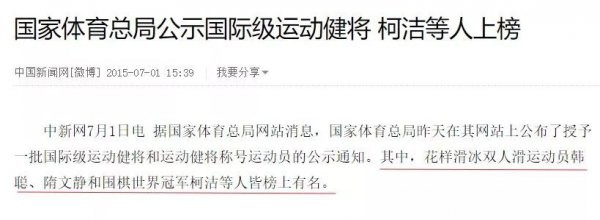 在国家体育总局的推荐名单中,柯洁的运动等级为国际级运动健将。早在2015年6月,他就被体育总局授予了这一称号。