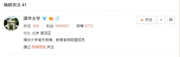 在柯洁微博的最新一条关注中,关注对象便是清华大学微博: