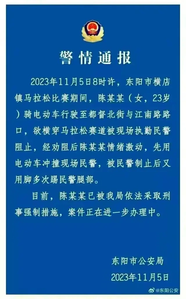 近日,在浙江举办的马拉松比赛,一名女子骑电动车经过管制路段时,被民警阻止,女子表现的非常嚣张。