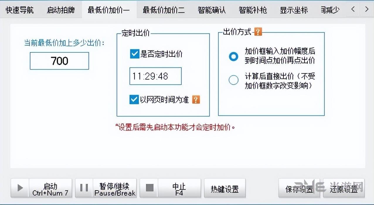 拍牌助手对“最低价加价1/2”功能配备了定时启动功能。一句话说明就是:原来启动该功能立即执行,现在指定一个时间让他等到时间到了自动执行,默认以网页上的时间为准。注意,设置后需启动才有效,比如设置+600定时到11:29:48启动,设置后需按下Ctrl+Num7才会开始下面的刷屏提示。千万注意:仅设置不启动的话到时不会启用功能。