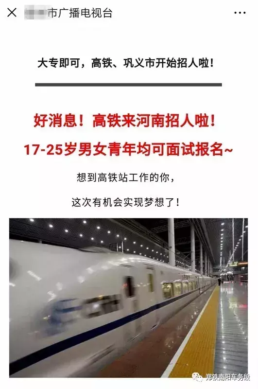 以郑万高铁河南段年底开通运营为例。届时,南阳车务段将接管平顶山西、方城、南阳南、邓州东等4个办理客运业务的高铁站,上述车站的工作人员全部由内部职工调配任职,我们从来没有面向社会发布过任何招聘启事。即便将来会补充分配过来一些新职工,那也是由郑州局集团公司人事部门统筹调配的。至于在高铁上工作的乘务人员,将来都归郑州客运段管理,与我们车务段更没有任何关系。所以,大家要擦亮眼睛、防止受骗哦……