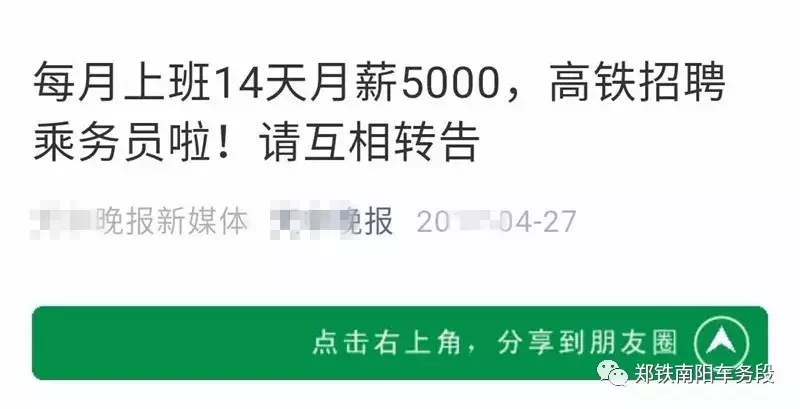 郑万高铁河南段年底就要开通运营,加上又到了毕业季,许多骗子又盯上了高铁乘务员这块“肥肉”大做文章,纷纷抛出各种吸引眼球的招聘广告,想趁机大捞一把。