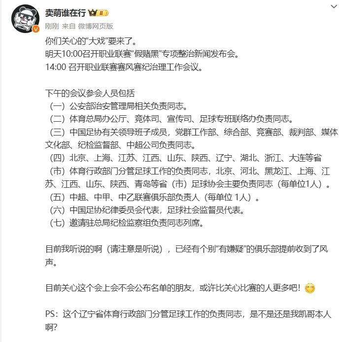 下午 14 点,足球行业内部的职业联赛赛风赛纪治理工作会议将举行,公安部、体育总局、中国足协、市体育局、联赛负责人等相关人员都将与会。