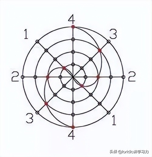 洛书转为九宫格数字如图20,然后每个数字和中间数字5相减(大减小),求得的差如图20。其中,坤~乾的数值为4-3-2-1,表示阴消后的数值(剩下的阴数)。乾~坤的数值为4-3-2-1,表示阳减后的数值(剩下的阳数),画四个间隔相同的同心圆,把数值放上去,连成平滑曲线,生成图21。