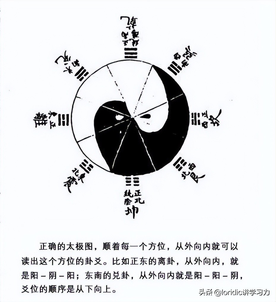 所以基于卦符从下往上的定义,看太极直接推出八卦需从外向内看。