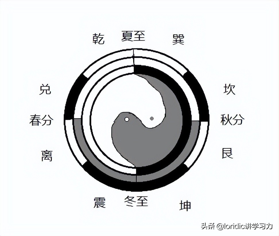 6、对应一年时间,北半球冬至最冷,为坤;夏至最热,为乾;从冷变热,是春分;从热变冷,是秋分,其他类推。