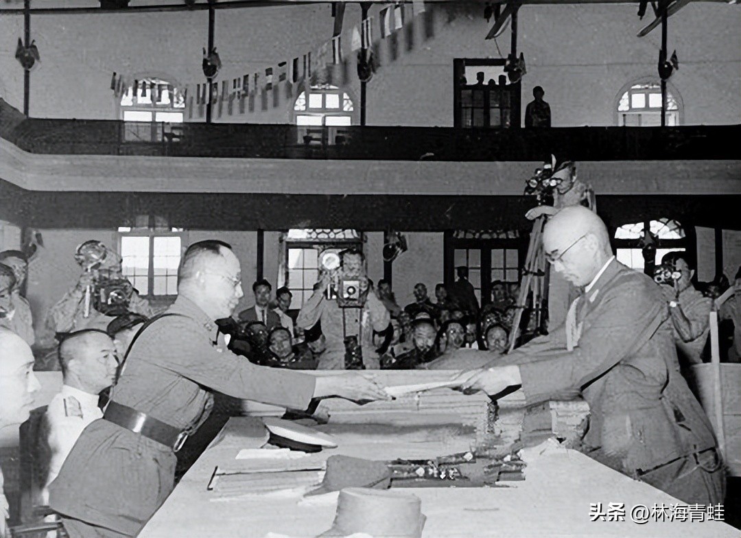 冈村宁次心情复杂地用毛笔在《日本投降书》上签字并盖上自己的名章,由其参谋长小林浅三郎将《日本投降书》双手呈递给中国陆军总司令何应钦,由于投降席桌面过于宽大,何应钦不得不起身双手迎接,这一历史性时刻被记者抓拍了下来,只是由于何应钦身体过于前倾而饱受非议,并被诟病至今,真可谓是细节决定成败啊。