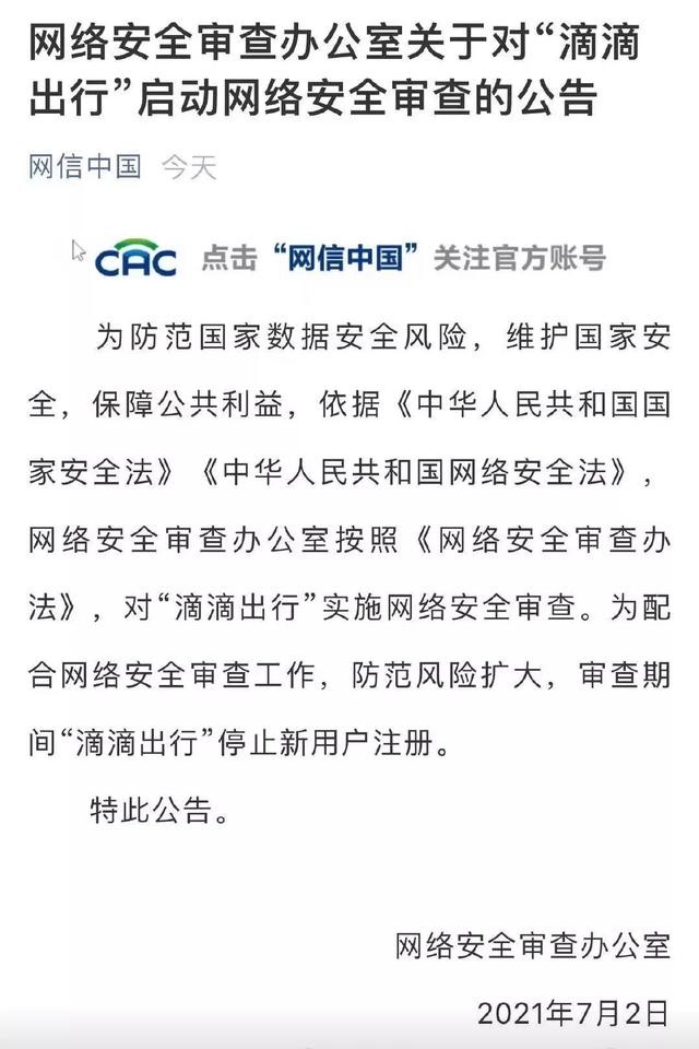 4、7月2日,网信办发声,正式调查滴滴,调查期间禁止滴滴新用户注册。