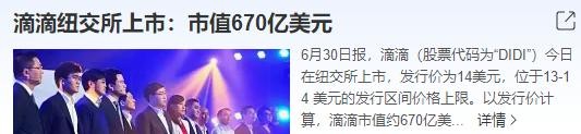 1、事情最初是从滴滴在美上市开始的:6月30日,滴滴在美上市,发行价14美元,市值670亿美元。