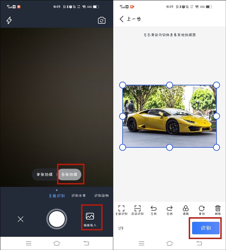 接下来我们找到我们相册里的图片,上传图片,它的独特之处在于它一次可以识别三十张图片。如果你有多张需要识别的图片,那么你就不用麻烦了,直接一次性上传就好。上传好图片之后,我们点击【识别】即可进入到识别页面。