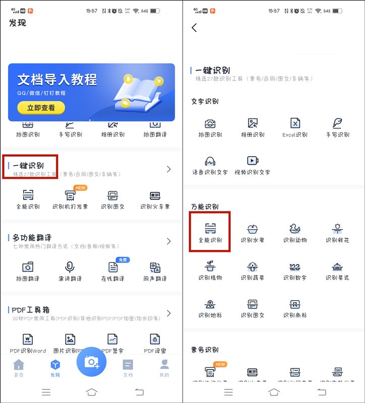 首先我们打开我们手机上的“迅捷文字识别”APP,点击进入,找到发现里面的【一键识别】,点击进入,可以看到里面有许多识别的功能选项,我们这里选择【全能识别】。