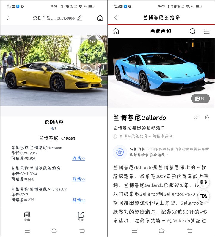 最后我们可以看到识别结果,显示了车子的型号,同时点击详情就可以进入到百度百科,可以查看关于该物品的详细介绍。