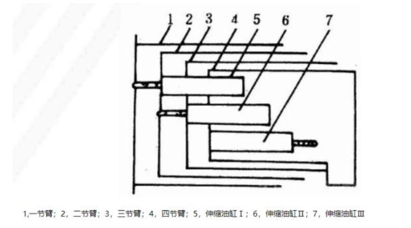 多缸伸缩如上图,可以实现各节吊臂的独立伸缩,但是这种方法成本较高而且需要的技术水平也高,因此在小吨位起重机中并不使用这种方法。